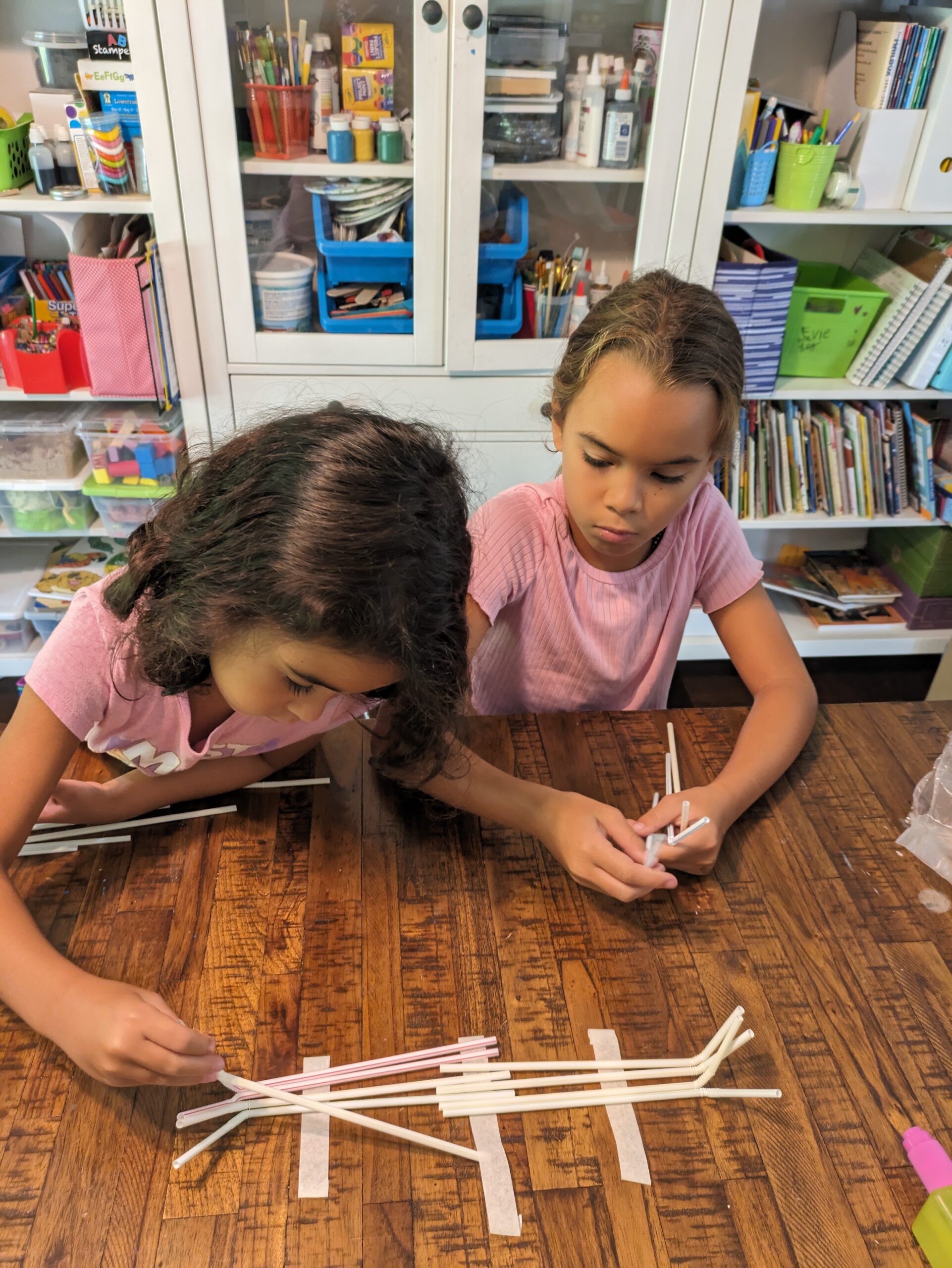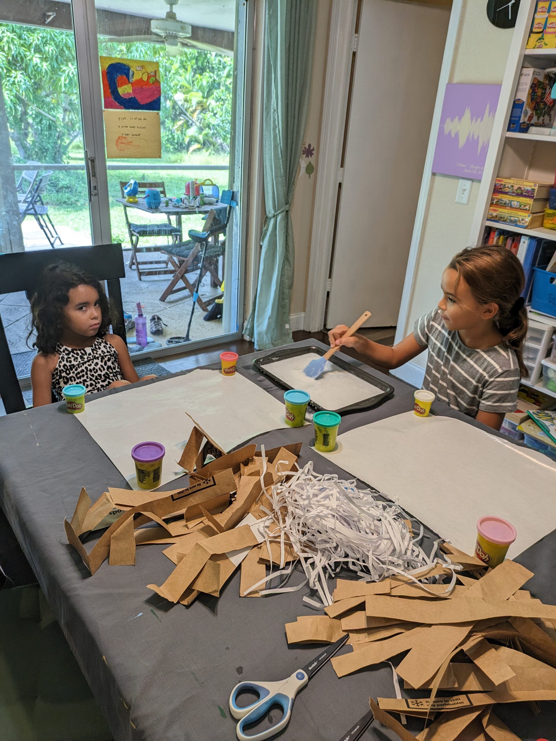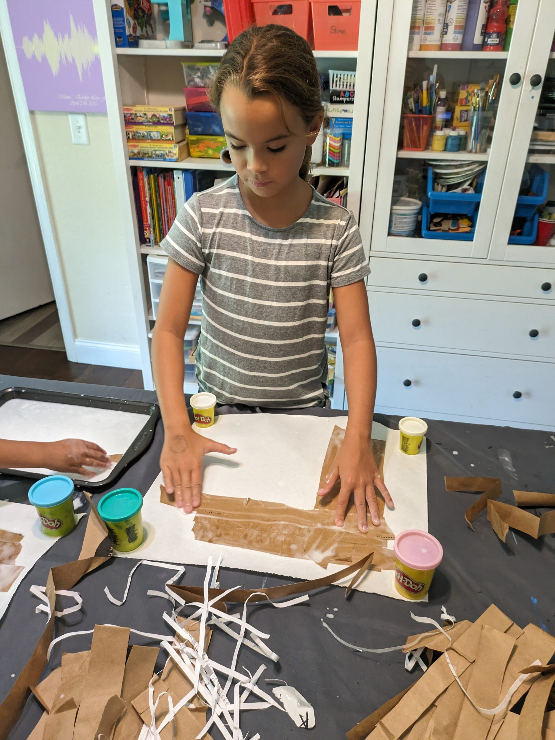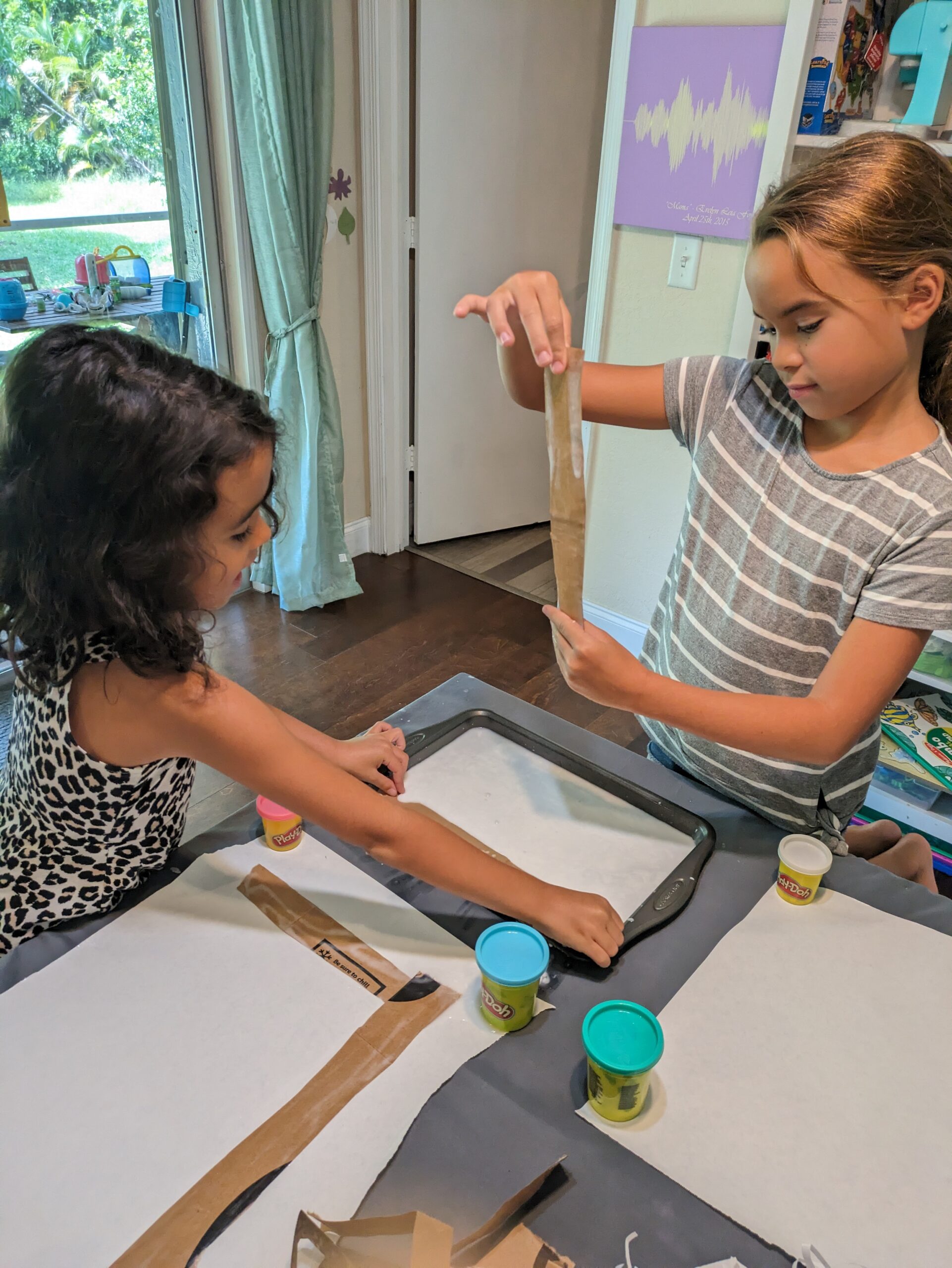 It took some paper grocery bags that we cut into approximately 1in strips. I used a cookie sheet to mix equal amounts of Elmer’s glue and water. Freezer paper was laid down so the paper did not stick to anything. The girls dipped the paper strips into the watery glue and then alternately laid them down horizontally and then vertically. A basket weaving would have been stronger, but it was a little hard for Isla, Evie did it some. It works just fine without the weave, as long as no gaps are left in between.