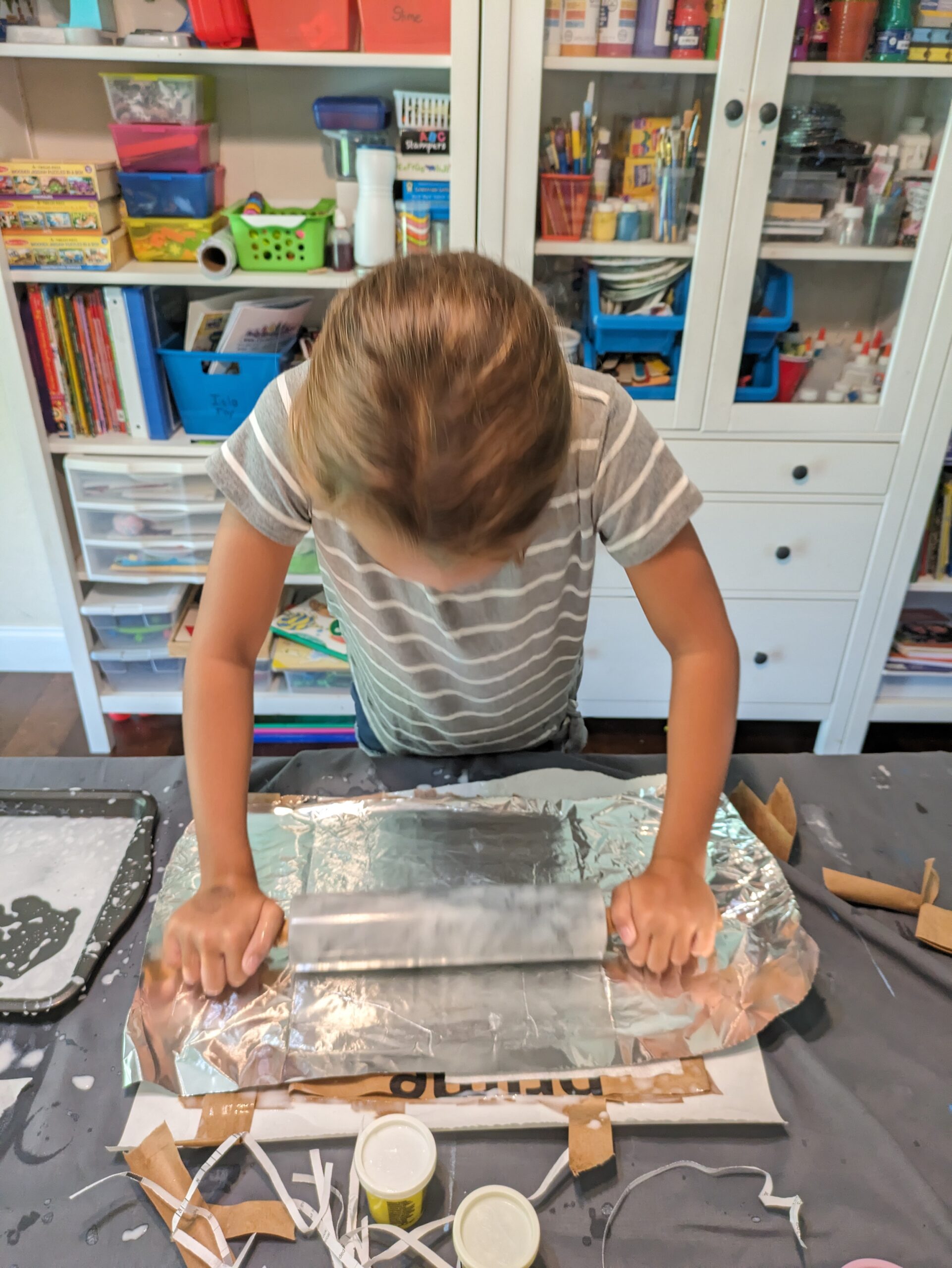 After laying them all down, we laid some paper towels on top of foil and the girls rolled out all the extra water, with a rolling pin. Remove the foil and paper towels and let it dry overnight.