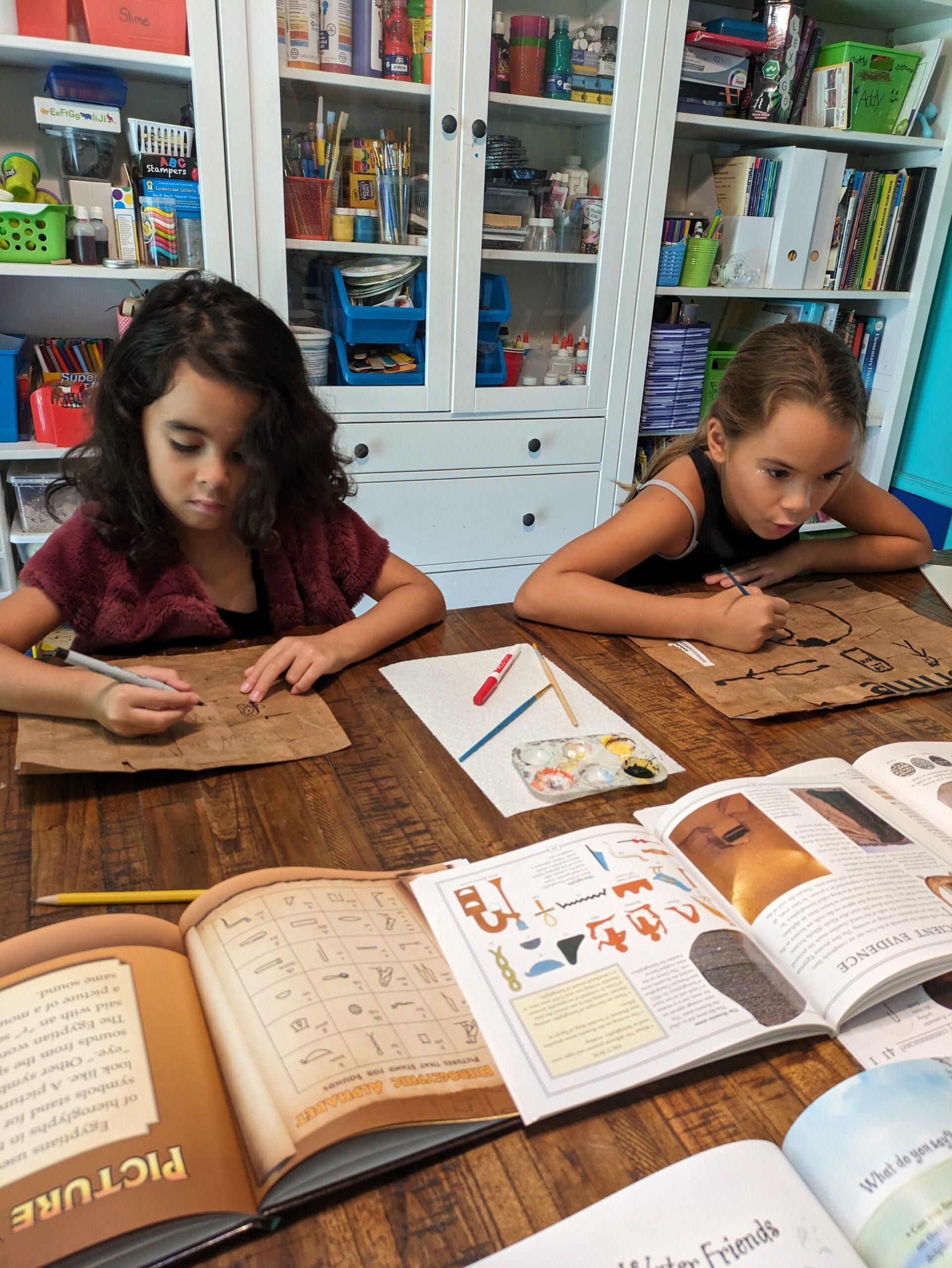 The next day, or maybe it was 3 or 4 when we got back to it, but we used the paper for further lessons. We learned about hieroglyphics and tried our hand at making some on our papyrus paper.