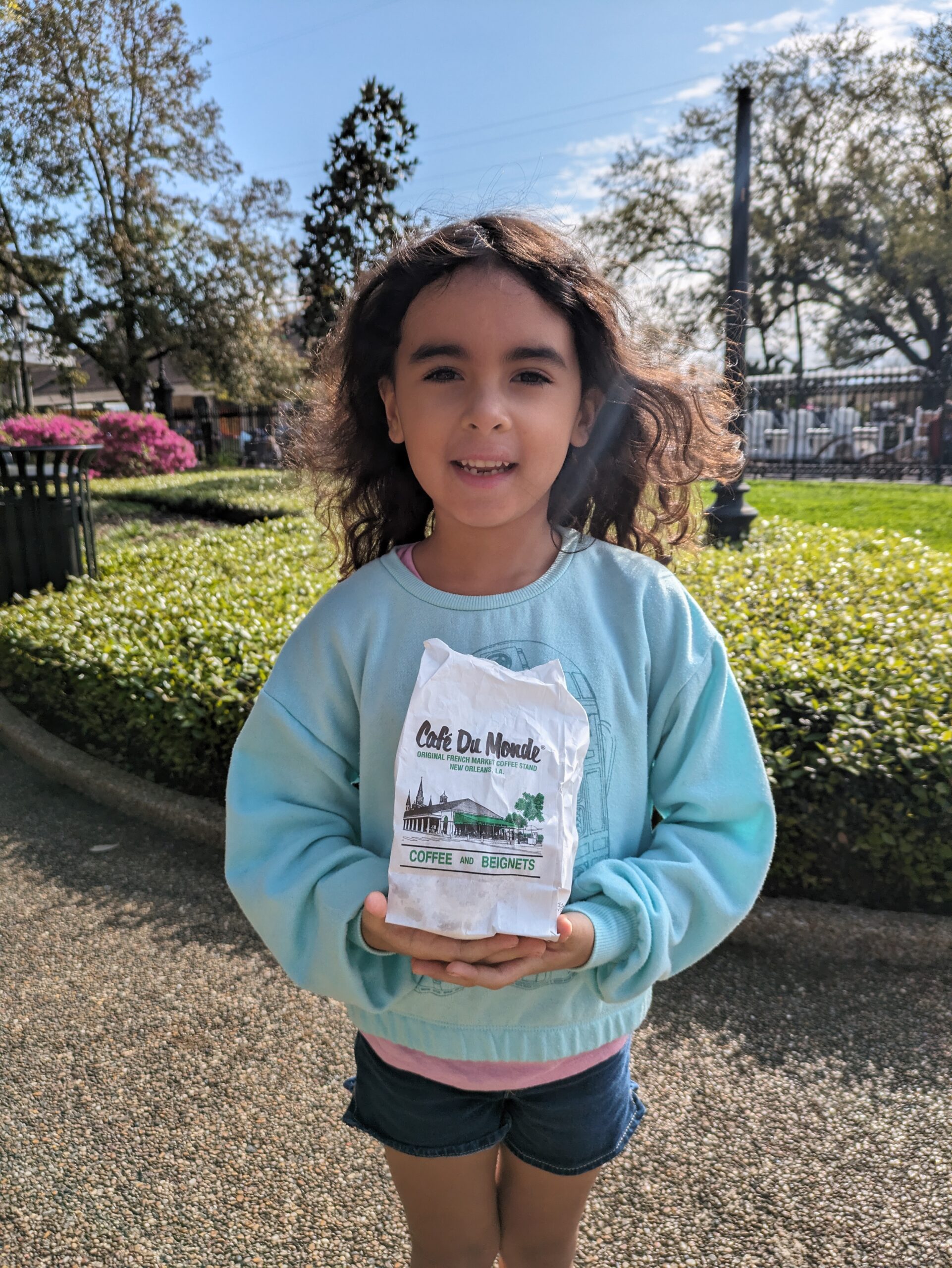 The one thing that was determined to do this time, because we did not the last time, was visit Cafe Du Monde and get the Beignets. The popular location by Jackson Square does have a long line, but I did not care. I was getting them and bought extras. Evie greatly dislikes donuts and was determined that she would not touch them. I am glad that I bought the extra because, as it turns out, she was definitely into them. We all enjoyed them and left a great trail on powdered sugar wherever we went.