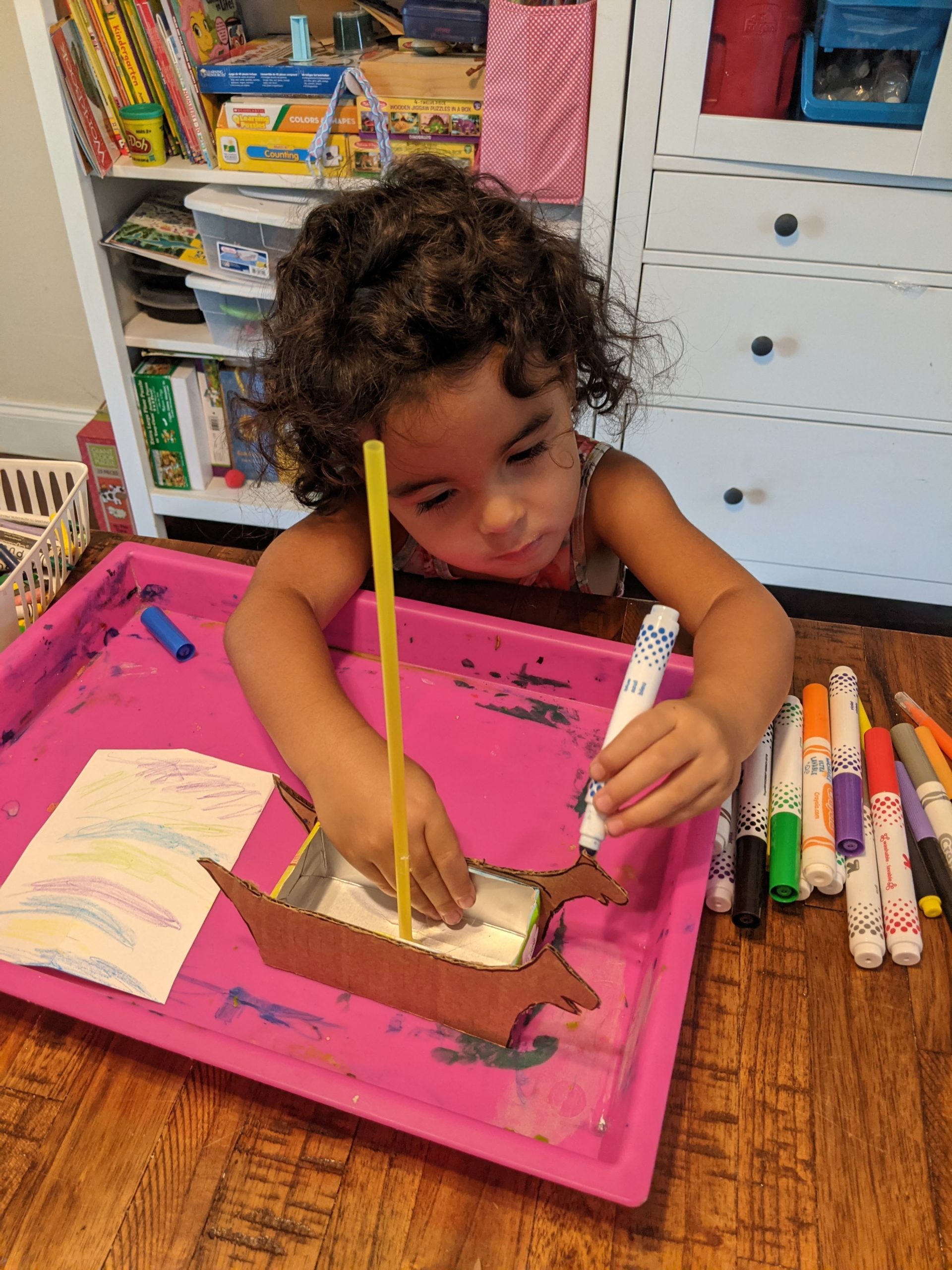 - Create and decorate a sail and make holes for a straw which you will hot glue in the boat. Add a flag.