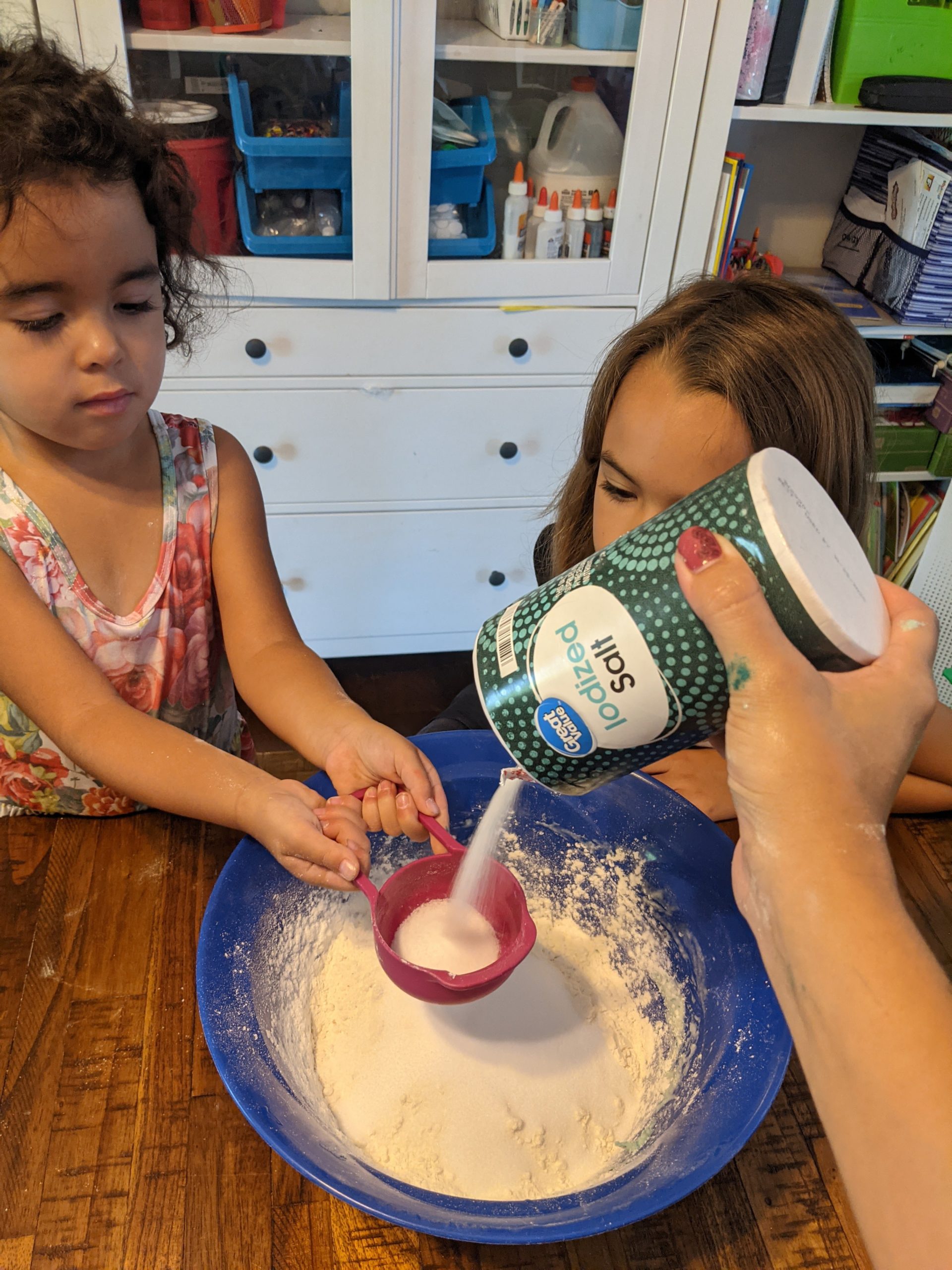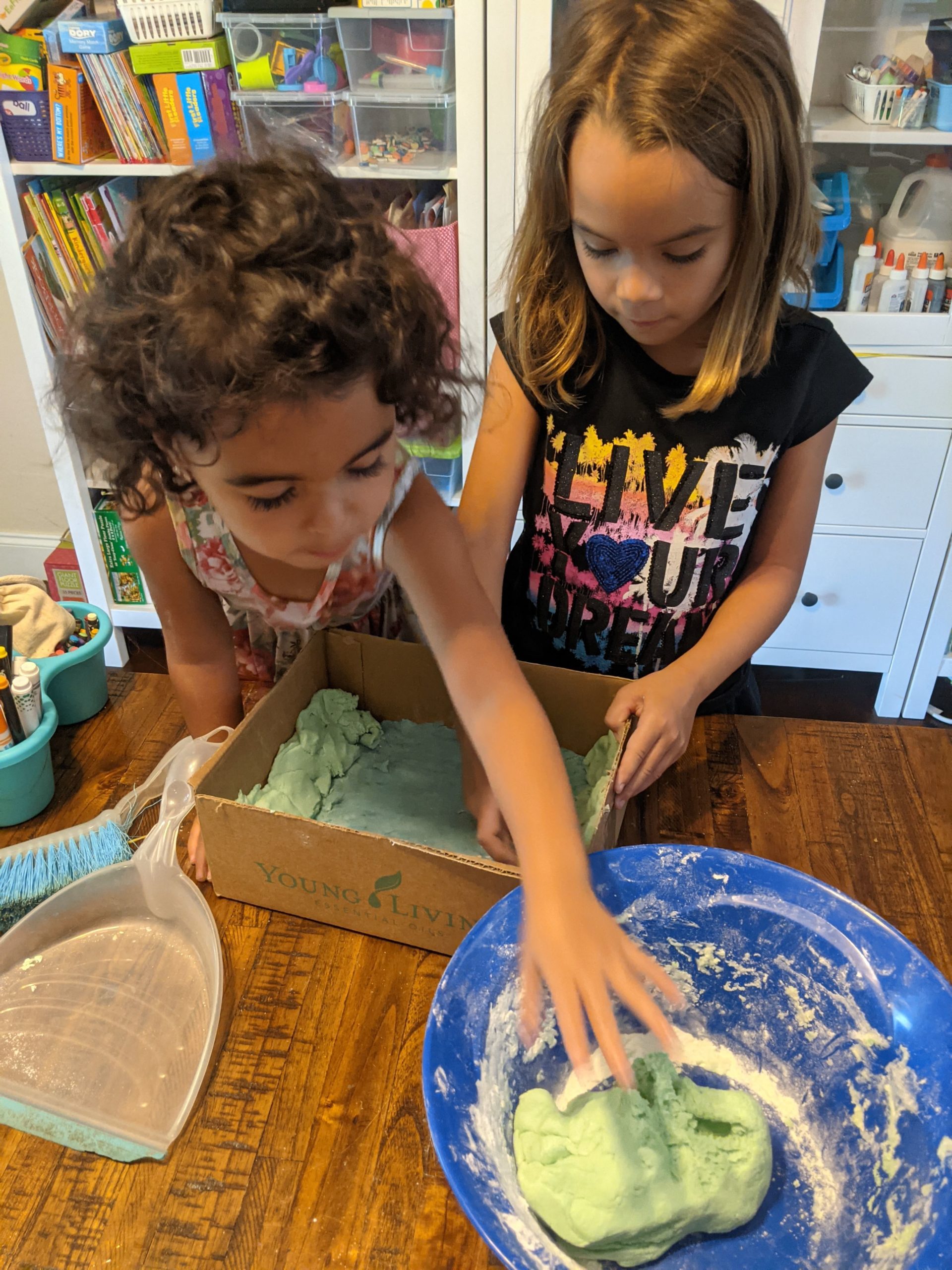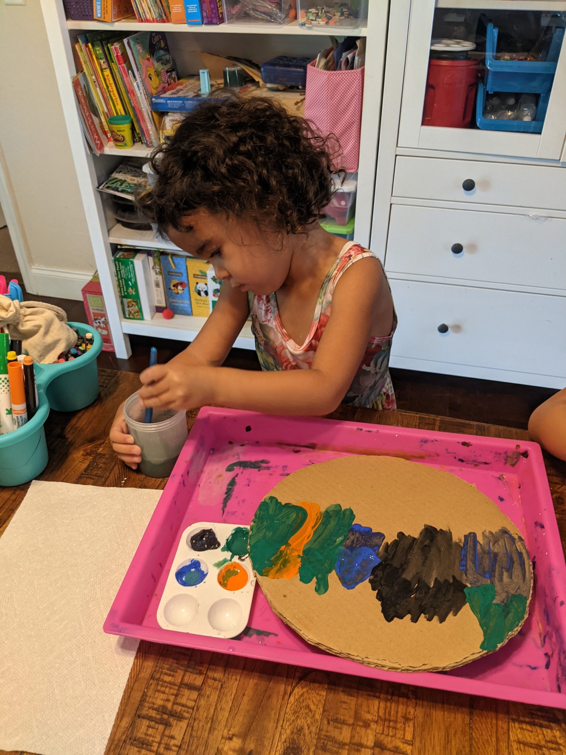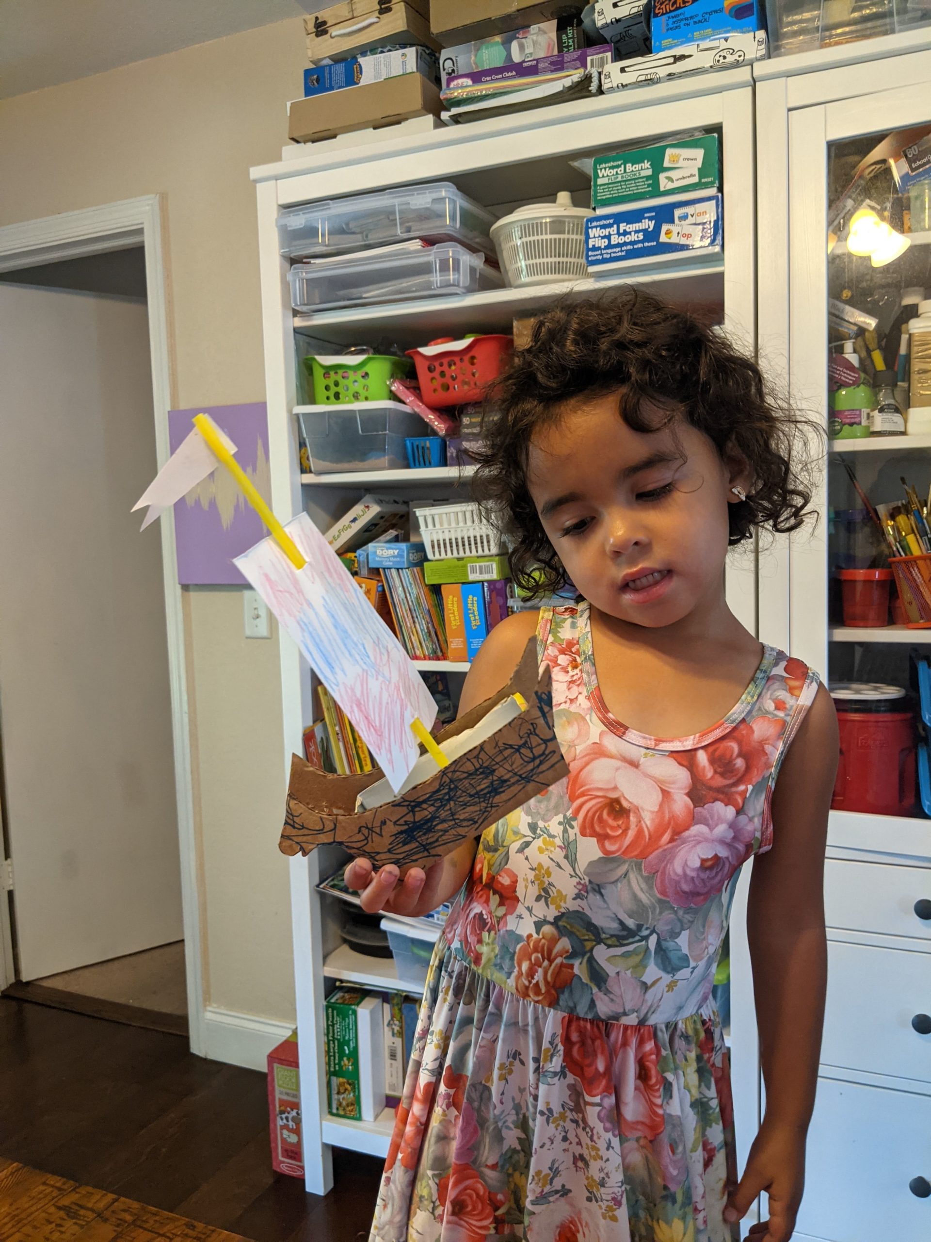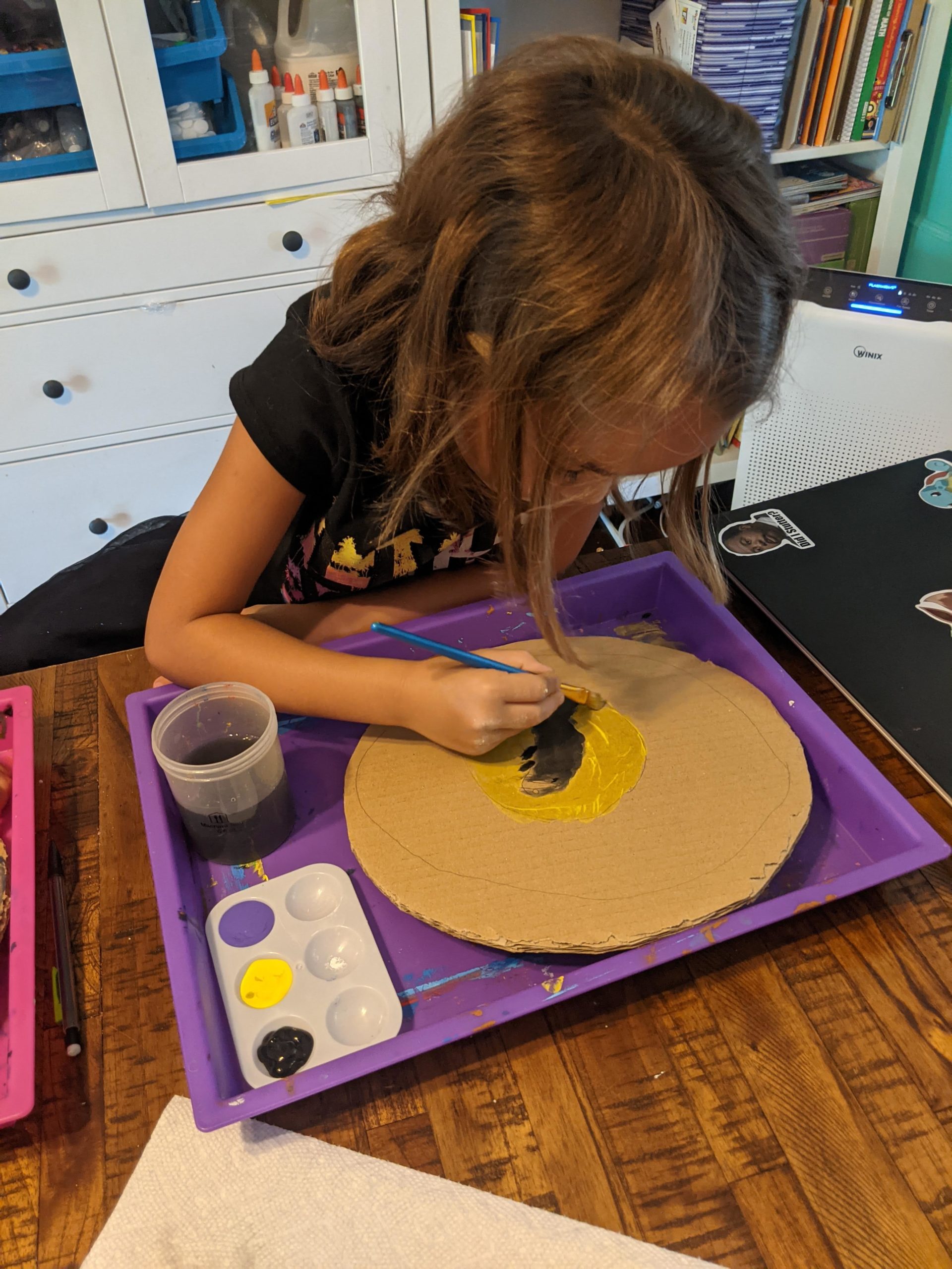 For a final fun project, we made shields. I simply found a big circular object and trace it onto cardboard. I explained that the colors and symbols normally had meanings to them so they picked their specific colors. Evie has to make her look like a Hufflepuff house shield with her badger and colors. Isla is unique like a rainbow. Cut some yarn and hot glue them into loops at the back and voila! They acted fiercely with their shields outside.