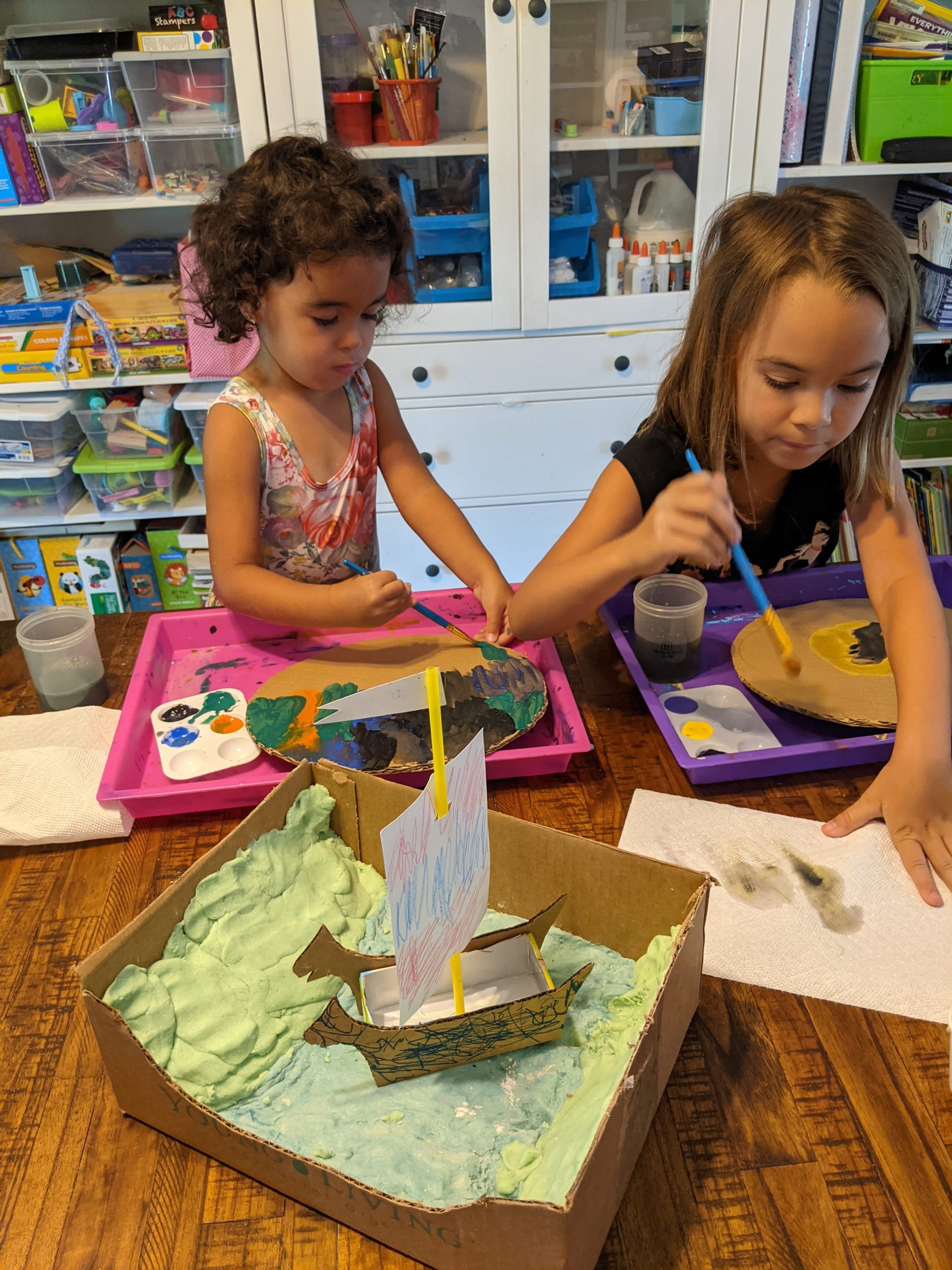 Then we mixed some playdough and created a fjord. A fjord is a long body of water that is typically surrounded by mountains on either side. I referred to the fjord in Frozen as an example and the idea clicked for them. We colored the playdough blue for the water and green for land and made sure that there were mountains. It was a perfect topography craft to display our boats in this week.